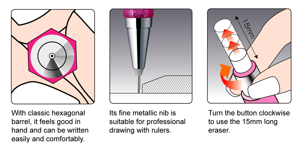 1_The barrel comes in seven bright colors with glitters. Its 0.5mm refill is suitable for writing or drawing. Turn the button clockwise to use the 15mm long eraser. With a pen clip, it is convenient to carry the product around.