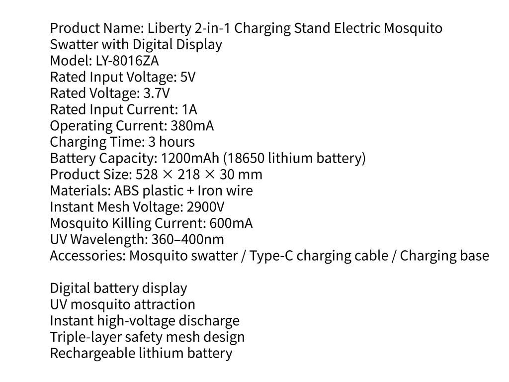 The Liberty LY-8016ZA 2-in-1 Charging Stand Electric Mosquito Swatter with Digital Display combines handheld swatting and upright UV mosquito trapping in one device for added convenience. The built-in LED digital display shows battery levels at a glance, while the high-voltage mesh quickly eliminates mosquitoes and insects. With the included charging stand, the UV mosquito-attracting function provides continuous indoor protection, making it ideal for home, office, and multiple environments.