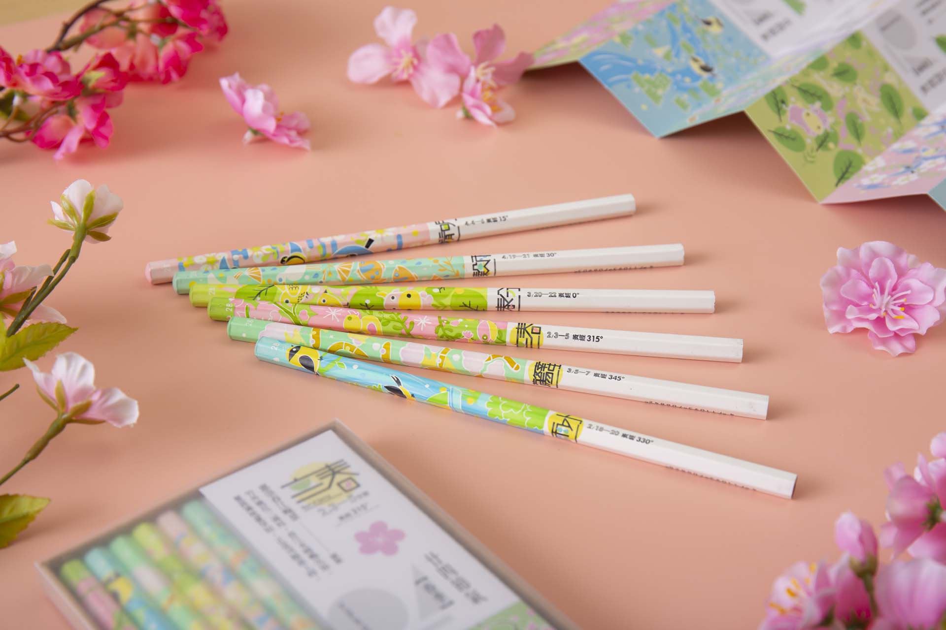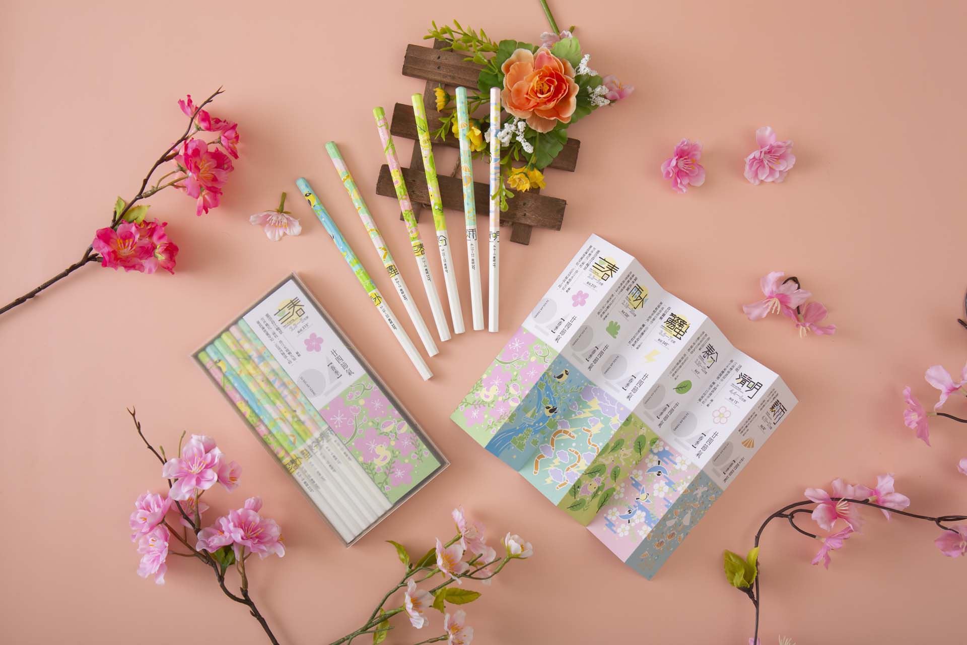 2_六角軸2B鉛筆は立春、雨水、啓蟄、春分、清明、穀雨の6モデルで異なる春の息吹を代表するイラストが印刷されています。