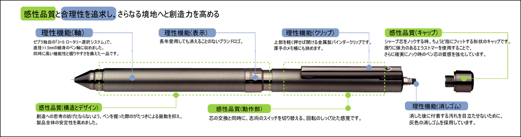 1_静音ロータリー機能による切換えシステムで、シームレスなデザインでペン芯を手軽でスムーズに交換できます。1本で3in1、意のままにジェルボールペン、ボールペン、シャープペンの3種類を組み合わせて切り替えられます。弾力があり強靭な金属製クリップに、灰色の消しゴムを追加しました。