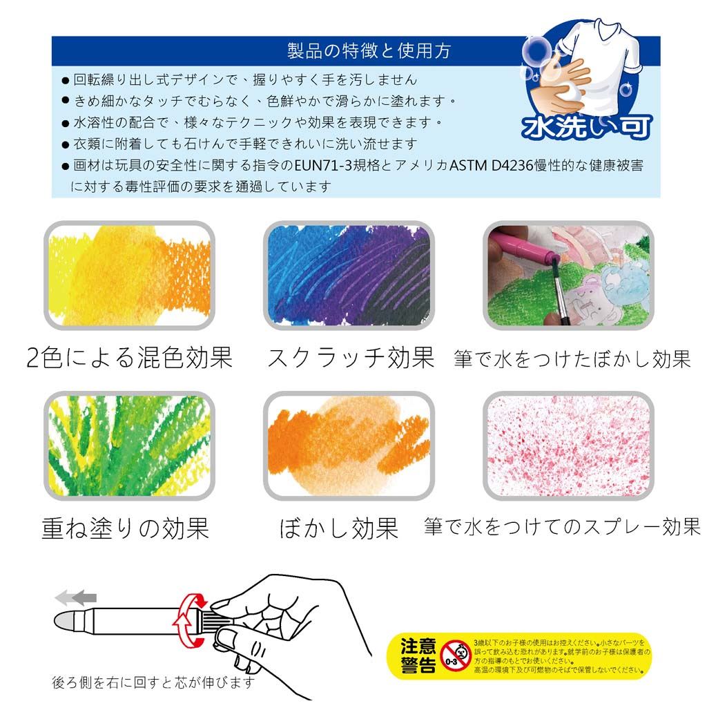7_回転繰り出し式水性オイルクレパスは、オイルクレパスと水彩の2種類の機能を兼ね備えています。(絵筆1本付き)