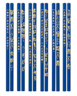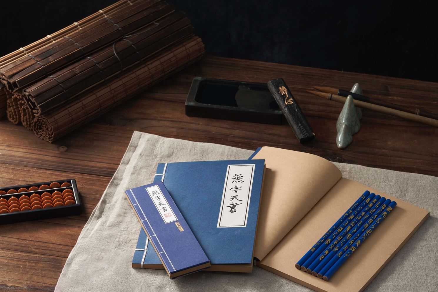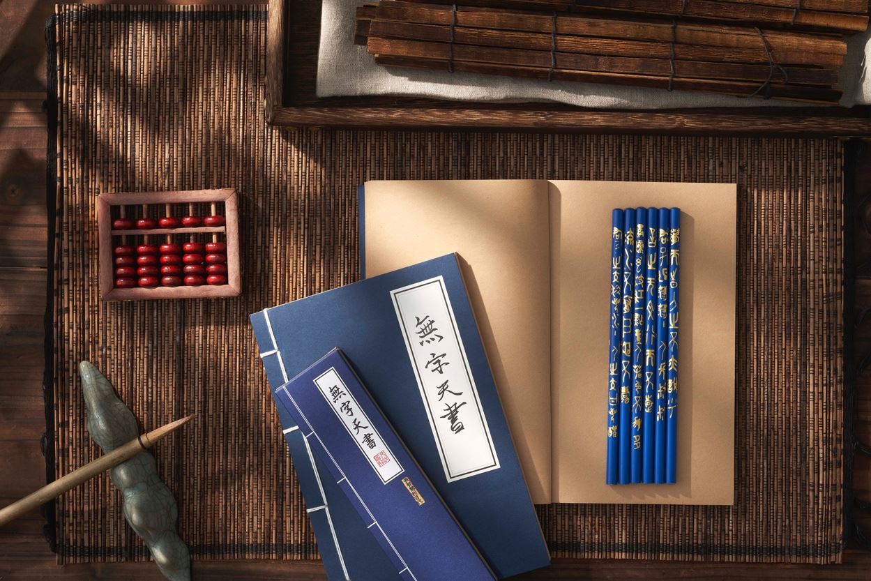 古書のスタイルからデザインのインスピレーションを得て、古書の姿をボックスで表現しました。無字天書(神々や天から賜った書物を指す。または読めないまたは難解な文字の比喩)の理念を融合し、古代の智慧と現代の想像力をパーフェクトに結び付けました。紺色ベースの軸にはに甲骨文、論語、孔子、王安石、荘子、呂氏春秋と左伝などの古代の文字と名言がプリントされ、知識の伝承と智慧の根源を表しています。