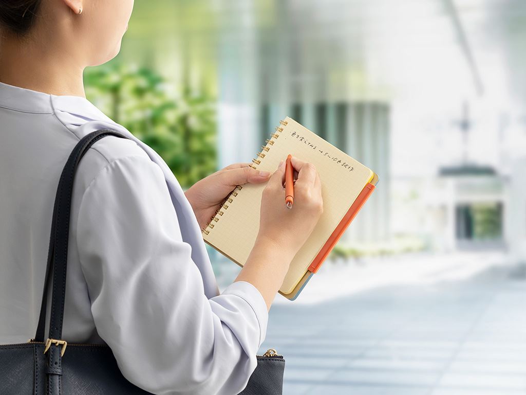 座っていても、歩いていても、いつでもどこでも。ピタンを使いたくなったら、ホルダーから取り外すだけでサッと書き出せます。ピタン専用ホルダーはノートの裏表紙・中表紙が0.3㎜~1.0㎜のノートに対応しています。