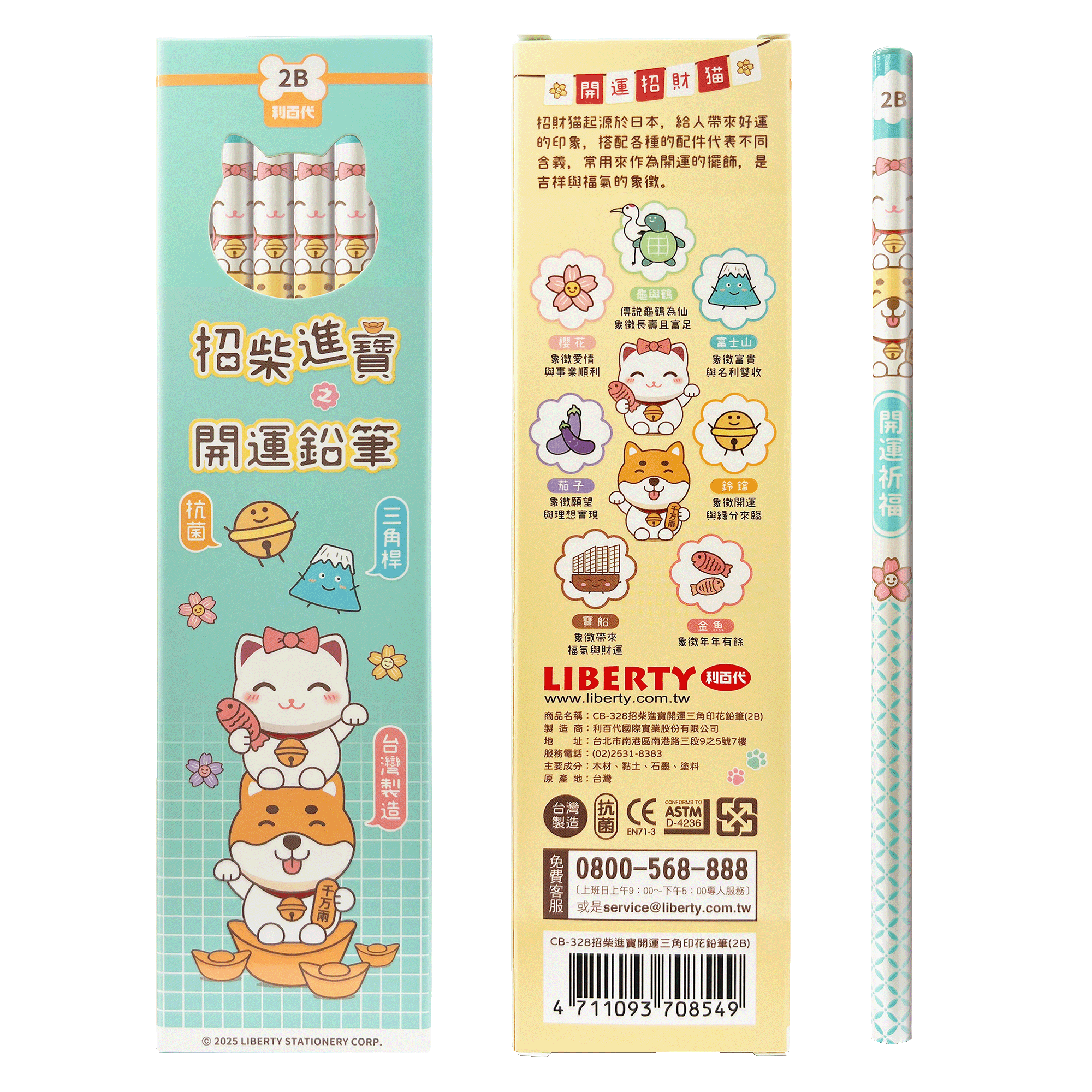 開運アイテムで、金運アップ! リバティCB328柴犬と招き猫の開運三角軸プリント2B鉛筆は、柴犬と招き猫の開運イラストをプリントしたキュートなデザインで、筆記時にも幸運を招きます!抗菌加工技術により、安心してお使いいただけます。安定品質の台湾製。人体工学に準拠した三角軸デザインは、スムーズで快適な筆記をお約束します。毎日使えば、幸運が一日中あなたのそばに!