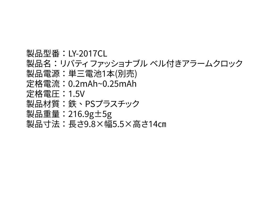 LY-2017CLリバティ ファッショナブル ベル付きアラームクロックは、クラシックな2つのベル付きデザインに、現代的でシンプルなデザインを結び付けた、レトロさと実用性を兼ね備えた卓上時計です。高デシベルの金属ベルを採用し、起床を十分にサポート。重度な寝坊助さんにも最適です。ビッグサイズの指針にクリアな文字盤で、スムーズに読み取ることができます。生活に質感と時間への正確さがもたらされます。