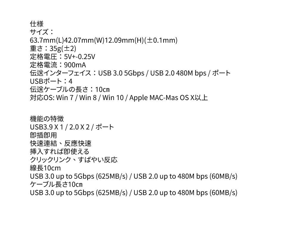 • 挿入すれば即使える、クリックリンク、すばやい反応 • ケーブルの長さ10㎝ • スロット数:USB2.0×3 / USB3.0×1 • 伝送速度:USB3.0 5Gbps以上(625MB/s) / USB2.0 480Mbps以上(60MB/s) • 対応OS:Win7/Win8/Win8.1/Win10/Apple MAC-Mas OS X