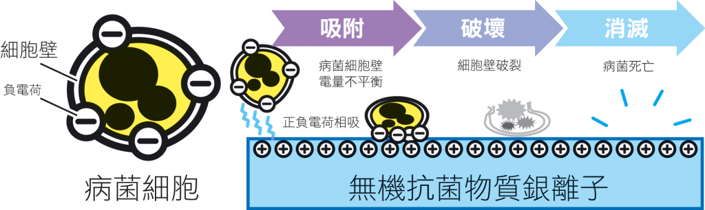 A 原理非常簡單:因為細菌的細胞壁是帶負電荷,而抗菌文具本體材質裡含有的無機銀系抗菌銀離子帶的是正電荷,分布在充滿吸附能力的合成沸石 上,當有細菌沾附文具時,細菌會被多孔的沸石吸附住,細菌的細胞壁接觸到均勻分布的沸石上帶正電荷的銀離子,進而造成細胞壁電量不平衡而破裂死亡;這種物理性無機抗菌原理更不會讓細菌出現抗藥性,是現今最被推薦與信賴的方式。