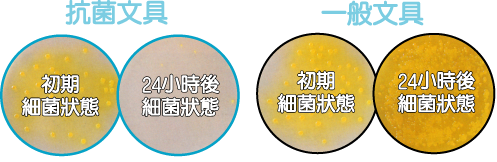以下是日本食品分析中心以大腸菌植在 PP 材質的塑膠面上的實驗,24小時後的結果顯示經過抗菌處理的樣本上幾乎不見細菌的存在,抗菌效果極佳。