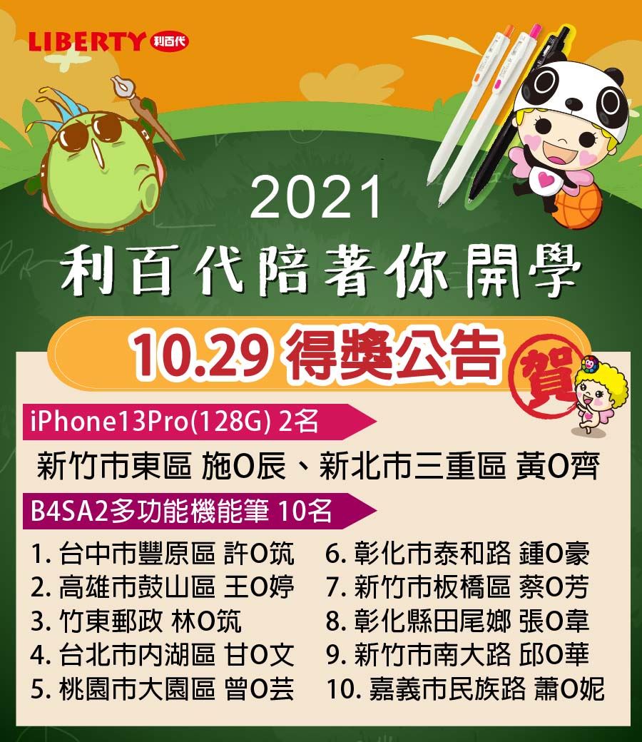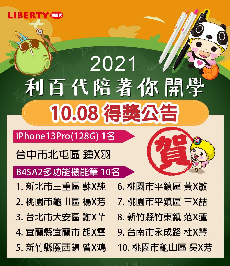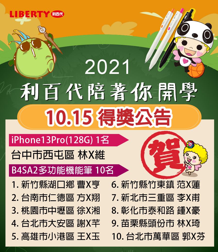 2021利百代陪著你開學,10.08 / 10.15 / 10.22 / 10.29 ~ 得獎公告(賀)