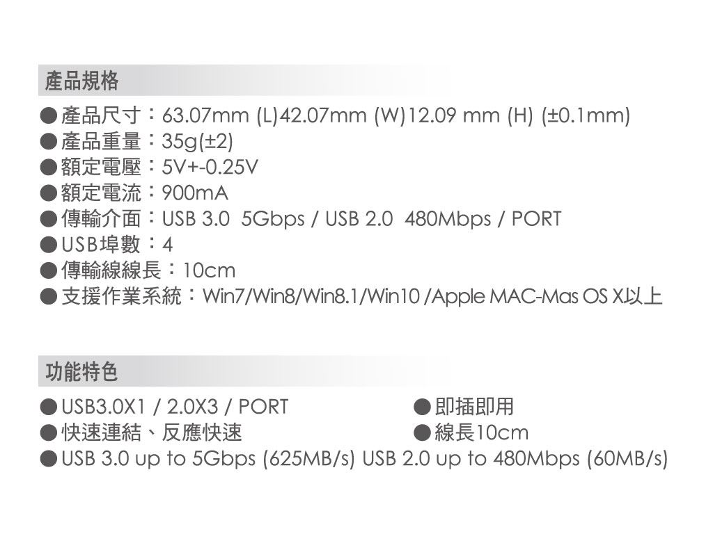 • 即插即用、快速連結、反應快速 • 線長10CM • 插孔數:USB 2.0x3/USB 3.0x1 • 傳輸速度:USB 3.0 up to 5Gbps(625MB/s)/USB 2.0 up to 480Mbps(60MB/s) • 支援驅動系統:Win7/Win8/Win8.1/Win10/Apple MAC-Mas OS X