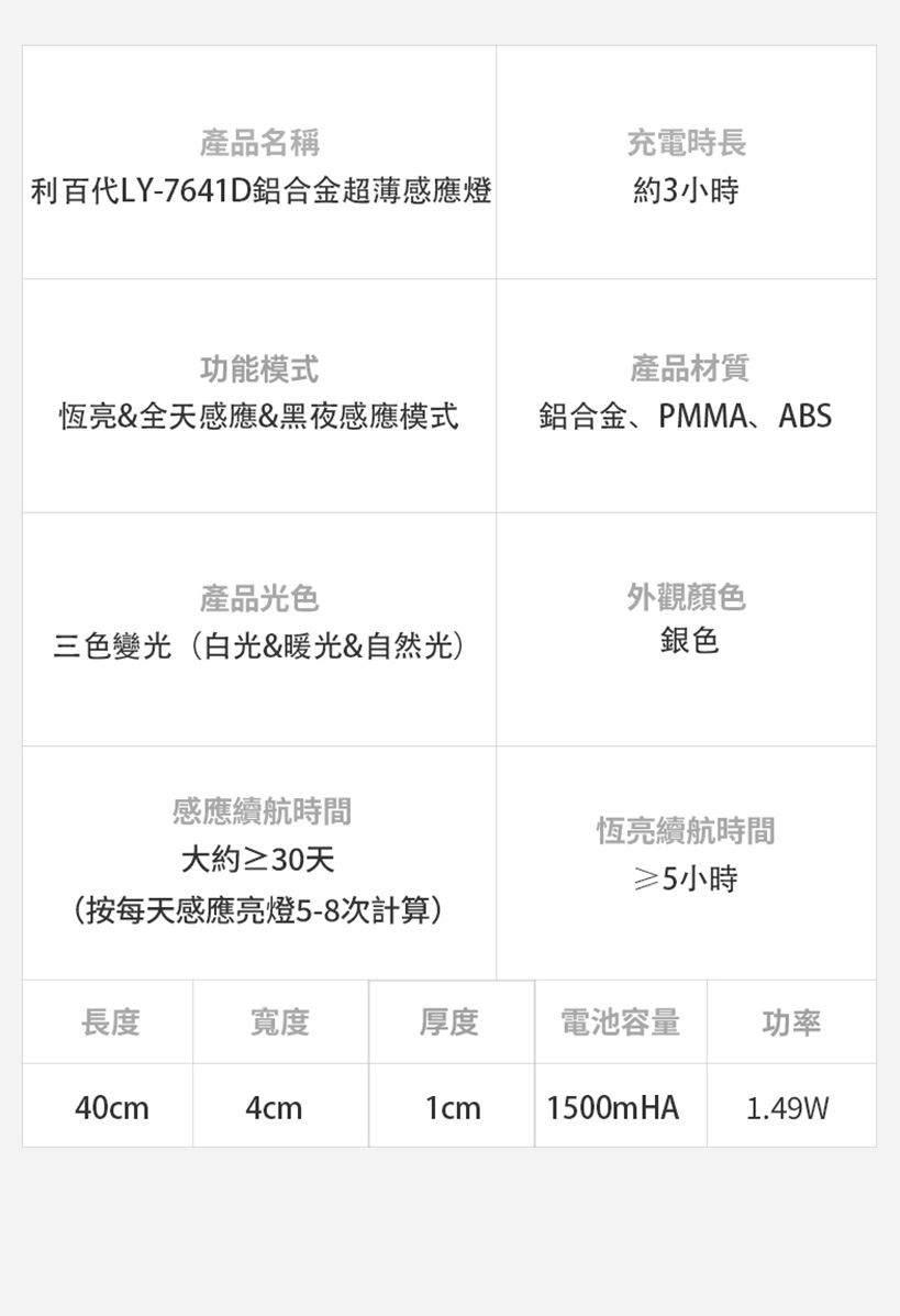 • 三色照明切換,自然光/白光/黃光自由切換。 • 三種感應模式,恆亮、全天感應、夜間感應(光線微弱時啟動)。 • 五段亮度調節,依需求調整最舒適亮度,120°廣角+3 米感應距離感應靈敏、覆蓋更廣。 • 強效續航力,恆亮約 6.6 小時;感應使用約 30 天(依使用模式而異)。 • 磁吸式安裝,免打孔、免佈線,附鐵片可用於非金屬表面。 • 多空間適用,客廳、廚房、走道、櫃子皆可輕鬆配置。 • Type-C 充電,通用接口,充電方便。