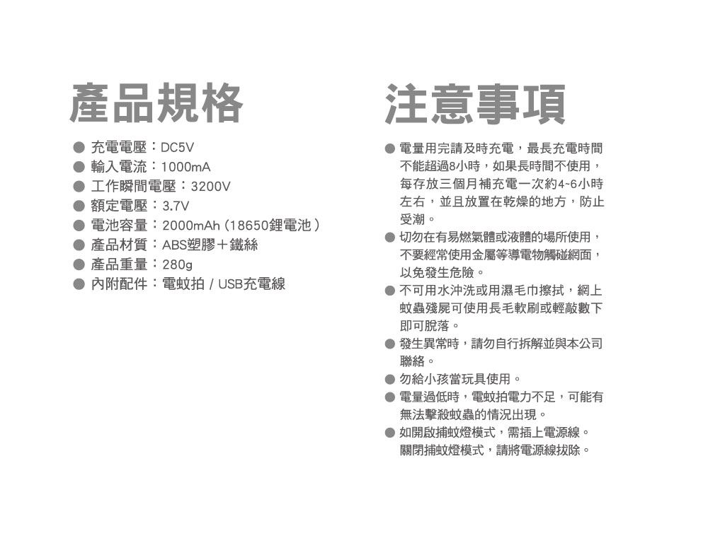 • 高效電網,工作電壓約 3200V,迅速擊殺蚊蟲。