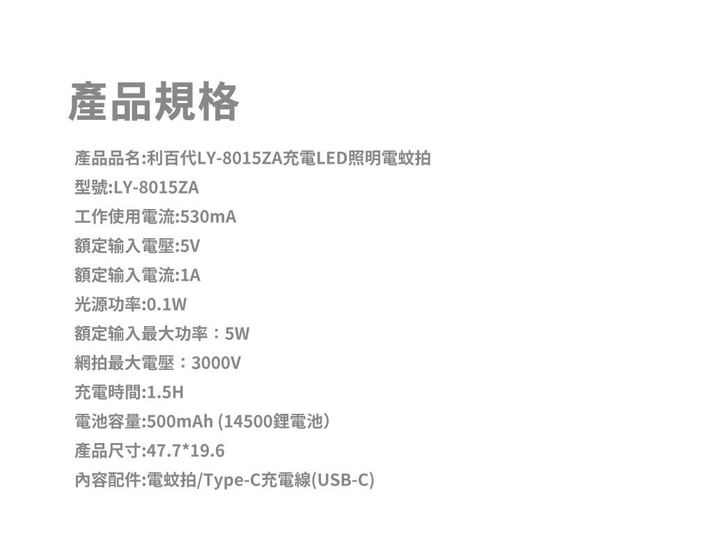 利百代LY-8015ZA充電LED照明電蚊拍採用 上下三層防護電網,兼顧安全與高效擊蚊效果。內建 LED 照明燈,即使在昏暗環境中也能快速鎖定蚊蟲位置。搭載 鋰電池充電式設計,具過充保護與 電量指示燈,使用更安心便利,並支援 Type-C 充電介面,通用性高、充電快速,是居家防蚊的實用好幫手。