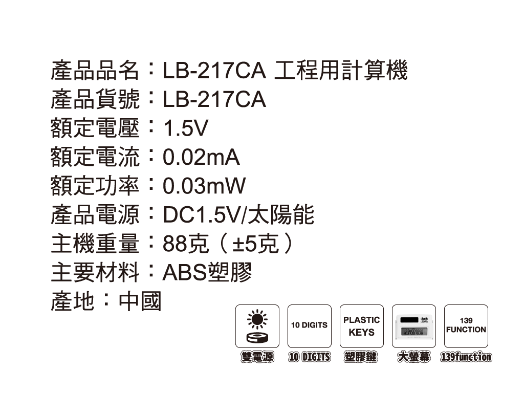誰說有手機就不用計算機?總不能一邊打手機一邊計算、報價吧?但是您可以一邊打電話、接手機,一邊按計算機。利百代LB-217CA工程用計算機在功能上非常完美,採用太陽能與電池併用設計,不怕電池沒電、老天爺不給晴天好臉色;多種模式、計算功能設定,且鍵盤增加希臘字母按鍵功能,運用範圍更高階、廣泛;大型液晶顯示幕好清晰、不傷眼!