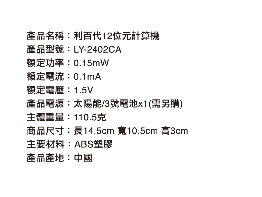 利百代 LY-2402CA 12位元計算機,搭載大螢幕顯示,數字清晰易讀,具自動檢視鍵,可自動計算步驟從開頭捲動至結尾,方便檢查運算過程。雙電源設計(太陽能+電池),省電又可靠。操作順手,適合商務、辦公與日常使用。