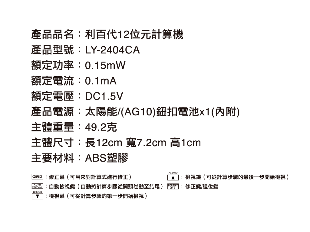 利百代 LY-2404CA 12位元計算機,具備大螢幕顯示與清晰大字體,提升閱讀便利性。附有皮套更方便攜帶使用。按鍵手感佳,搭配太陽能與電池雙電源,操作穩定、耐用,是辦公室與居家計算的理想選擇。