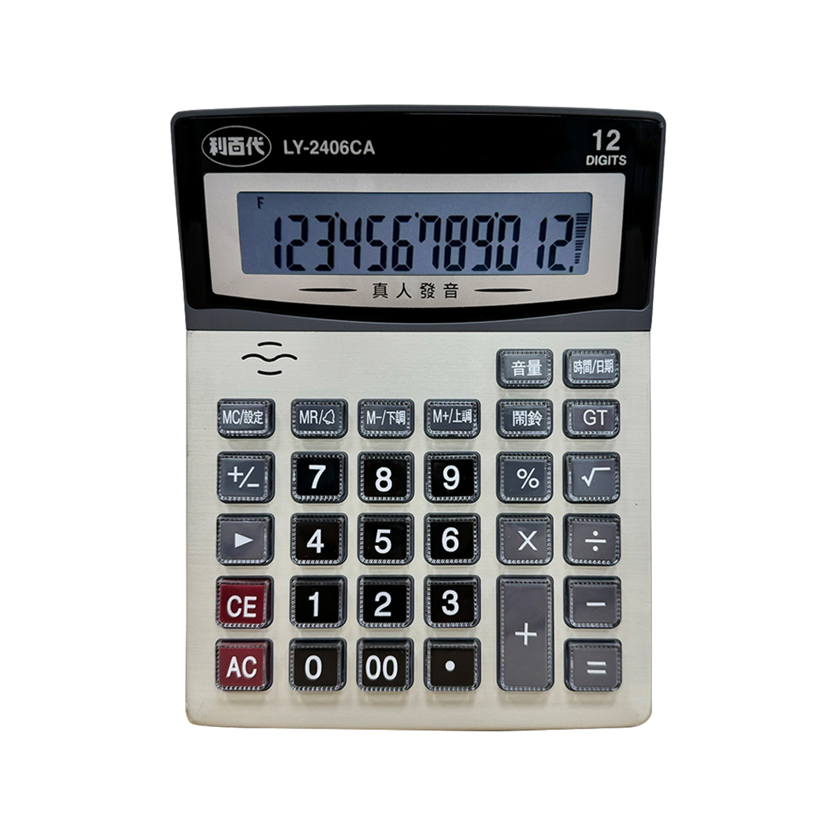 利百代 LY-2406CA 14位元計算機,採用超大螢幕與大字體顯示,清晰易讀。內含語音和鬧鈴功能,操作簡便,效率加倍。靈敏按鍵搭配仰角設計,使用舒適不卡鍵。電池供應,穩定又耐用,適合商務與日常使用。