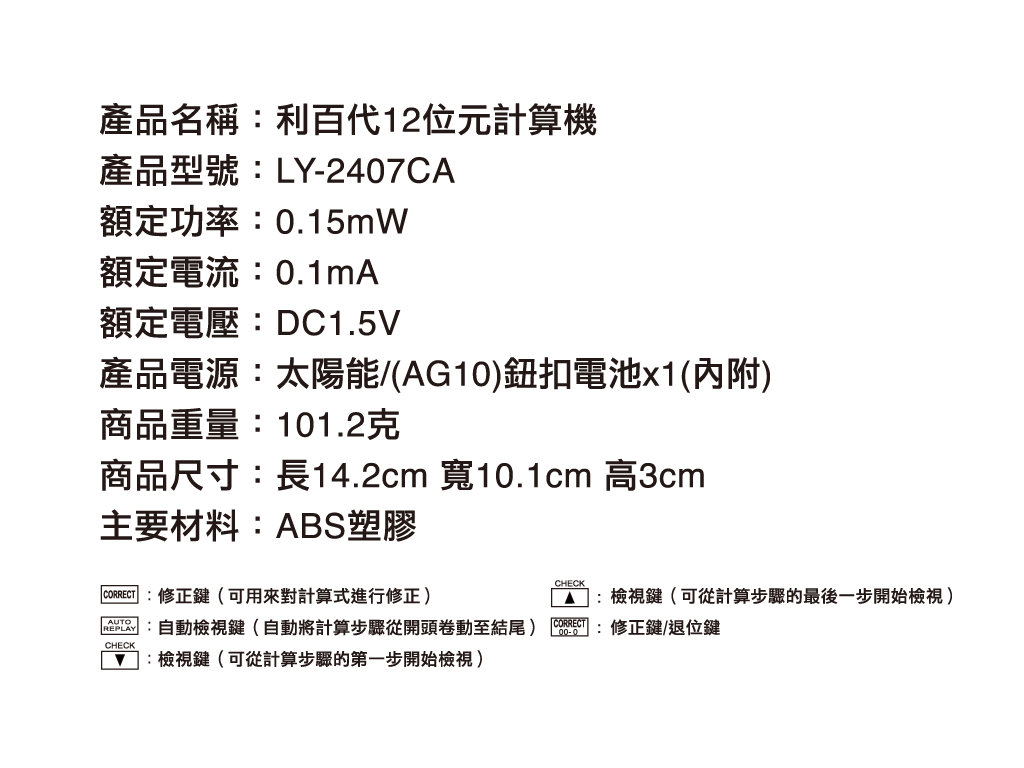 利百代 LY-2407CA 12位元計算機是一款實用耐用的桌上型計算機,適合辦公室、商業或日常使用。擁有12位數大螢幕顯示,字體清晰,方便閱讀。操作簡便,大按鍵設計提升使用舒適度,有效減少輸入錯誤。太陽能與電池雙重電源供應,節能又可靠。