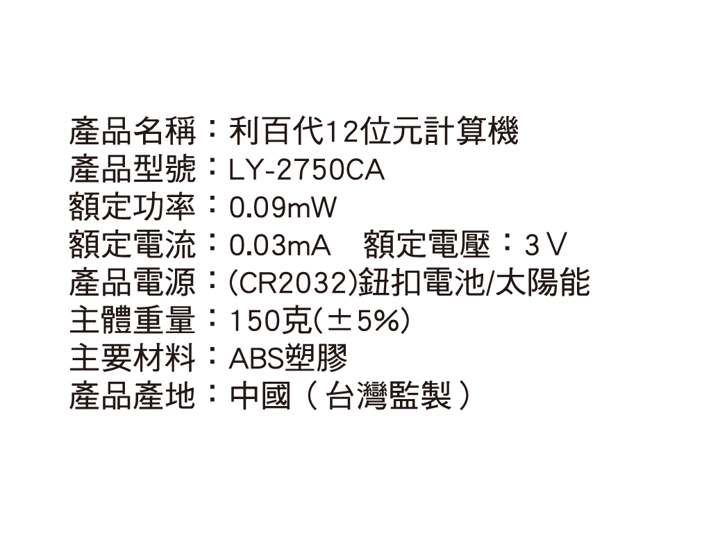 利百代 LY-2666CA 12位元計算機,具備大螢幕顯示與清晰數字,閱讀更輕鬆。大按鍵設計手感舒適,有效提升輸入準確性。內建加減乘除、稅率計算、利潤計算、記憶功能等多項實用功能,太陽能與電池雙電源設計,節能穩定,適合長時間使用。外型穩重大方。