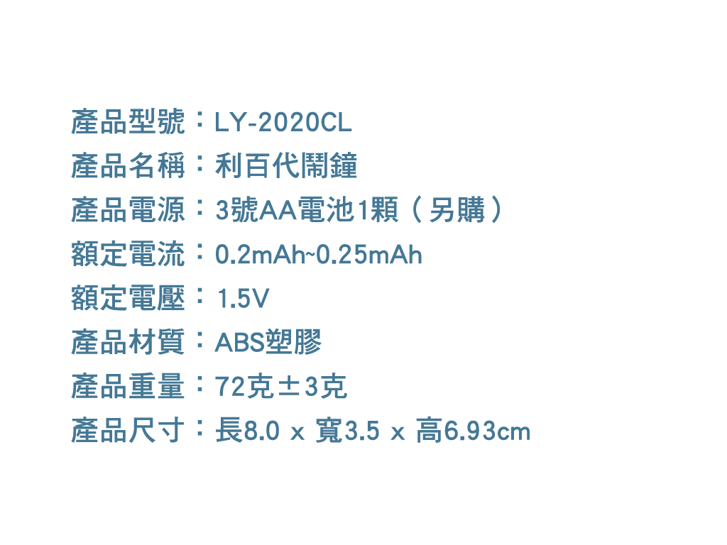LY-2020CL 是利百代精心打造的實用型鬧鐘,設計簡約大方,結合實用與美感,適合家庭、教室、辦公室等各種空間使用。提供清晰易讀的時間顯示,讓您掌握每一分每一秒。