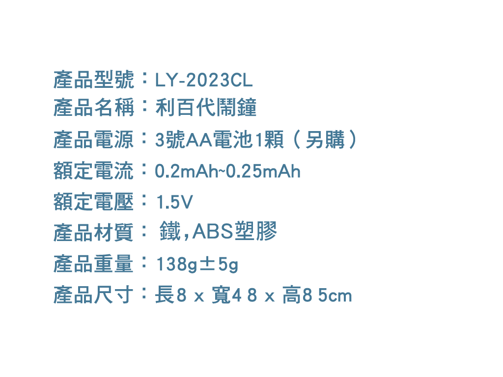 利百代 LY-2023CL 靜音鬧鐘使用圓形設計搭配大字數字,清晰易讀,外型簡約美觀。具備貪睡功能與簡單鬧鈴開關,操作直覺便利。體積輕巧,具有小夜燈功能,晚上也能看時間,無論擺放在床頭邊、桌面、電話旁、客廳都非常很適合,貼心滿分。
