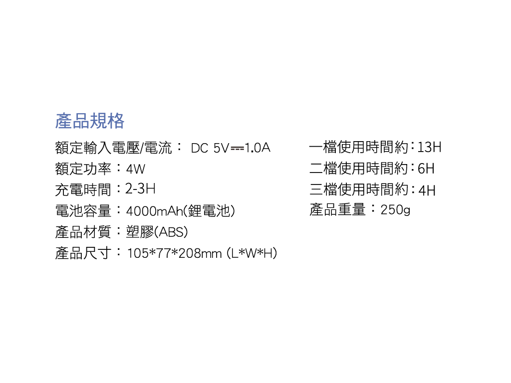 • 大容量電池,續航力持久 • 三片式大風葉設計風量強勁 • 1檔約13小時、2檔約6小時、3檔約4小時 • 按鈕式開關,三檔風速
