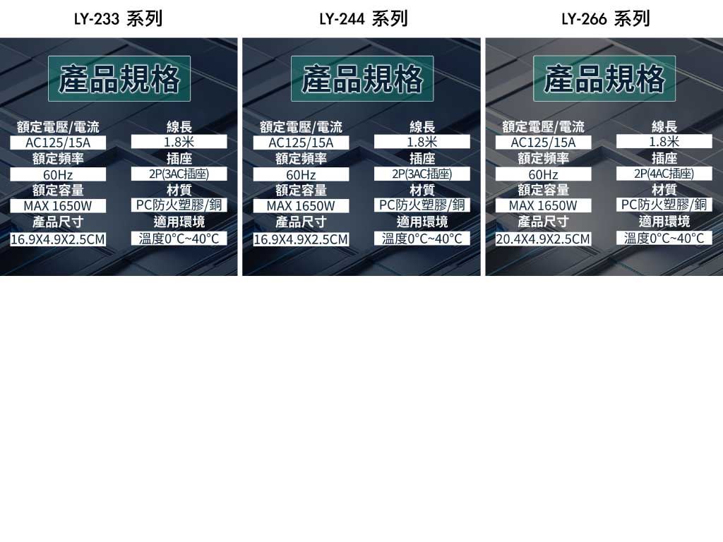 利百代LY-233、244、266系列延長線(LY-23306、LY-23309、LY-24406、LY-24409、LY-26606、LY-26609),採用插頭獨立開關設計,可分別控制各插座電源,節能又安全。搭配高品質銅導體與耐熱外殼,導電穩定、使用安心。適合家用電器、電腦週邊或辦公設備,是居家與辦公空間的電源好幫手。
