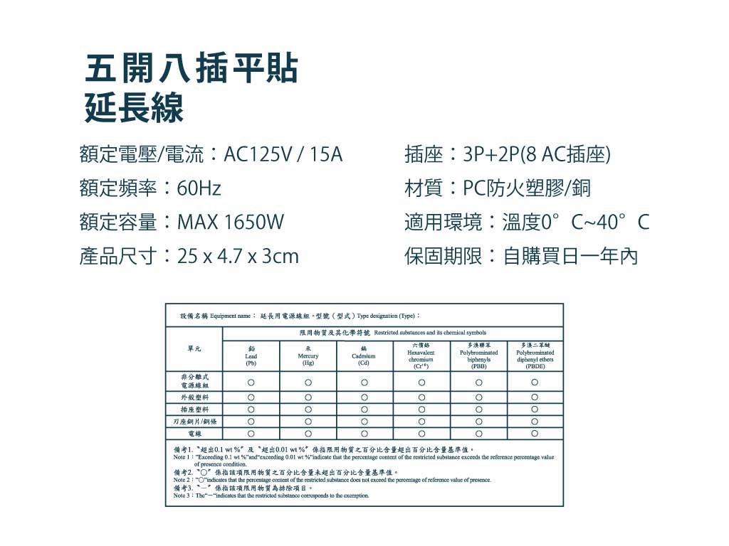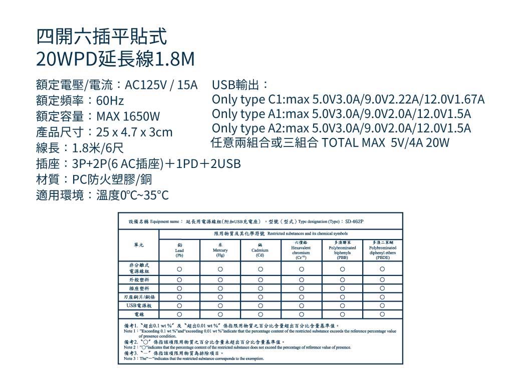• 按壓式過載保護總開關,平貼式防誤觸按壓開關 • 藍冷光電源指示燈 • PC防火材質/BSMI新安規/MAX1650W/PD快充/QC3.0快充 • 90度斜角插頭不干涉其它插座,專利省空間插座 • VCTF2.0mm²高功率輸出安全電線